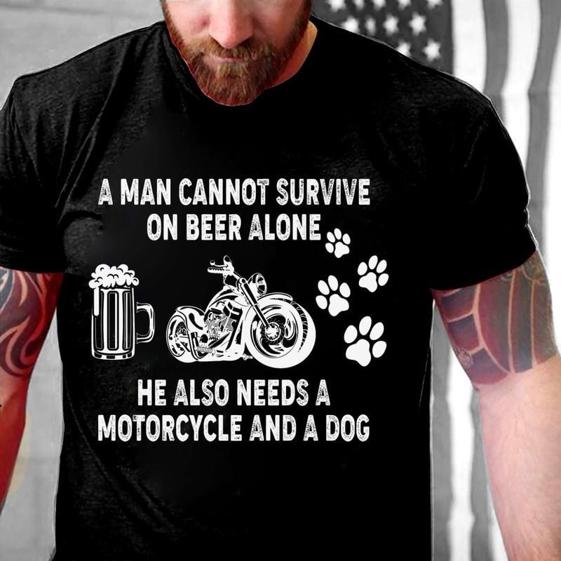 Bikergod Motorcycle A Man Cannot Survive On Beer Alone He Also Needs A Motorcycle And A Dog T-Shirt, Crew-Neck Sweatshirt, Hoodie, Tank Top, V-Neck T-shirt Design 2D Full Printed Sizes S - 5XL NABU284