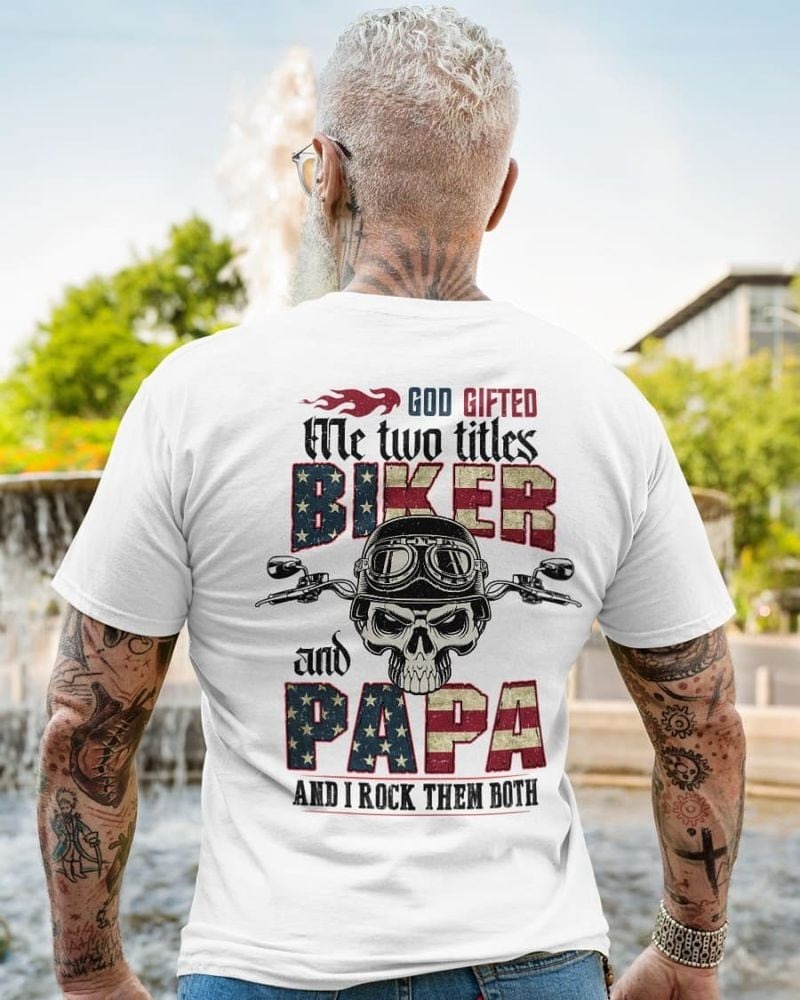 Bikergod Motorcycle God Gifted Me Two Titles Biker And Papa T-shirt, Crew-neck Sweatshirt, Hoodie, Tank Top, V-neck T-shirt Design 2D Full Printed Sizes S - 5XL - NAJA429